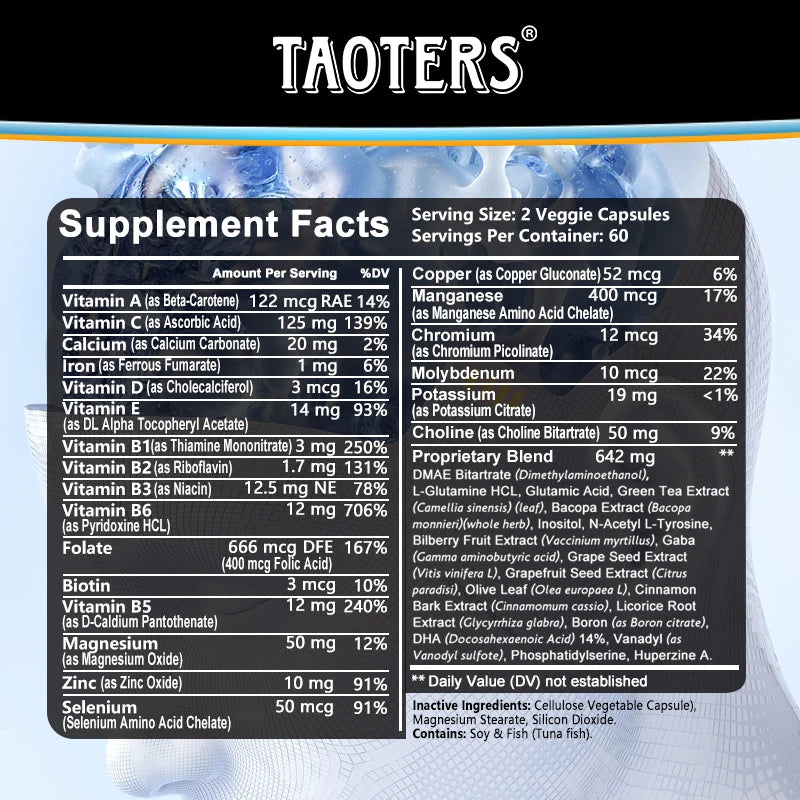 Multivitamin & Multimineral, Nootropic Brain Support Supplement, Supports Memory, Concentration & Alertness, 120 Capsules
